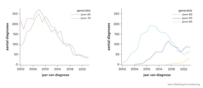 Als we kijken naar de nieuwe hiv-diagnoses onder mannen die seks hebben met mannen (MSM) valt nog iets op: na jaren van daling bij mannen geboren vanaf de jaren 80, stijgt het aantal nieuwe diagnoses onder deze generaties weer. Het aantal nieuwe diagnoses bij MSM geboren vóór 1980 blijft juist dalen.
