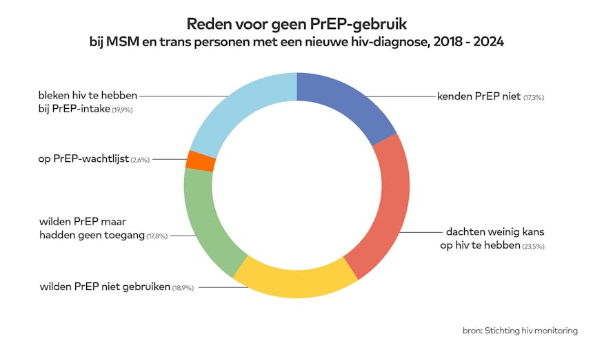 Een deel van de MSM en trans personen die in de periode 2018-2024 een hiv-diagnose kregen, en geen PrEP gebruikten, gaf aan waarom ze dat niet deden. Nog te veel mensen kenden het middel niet, onderschatten de kans op het krijgen van hiv, of hadden geen toegang tot PrEP: