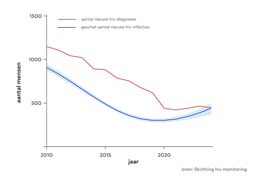 In 2024 waren er 444 nieuwe diagnoses en naar schatting 440 nieuwe hiv-infecties (met een onzekerheidsmarge van 330 – 500, in lichtblauw). Tussen het moment van hiv oplopen en het stellen van de diagnose zitten vaak meerdere jaren.