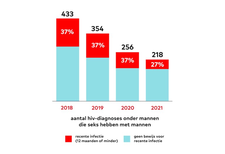 Voor het eerst is een scherpe daling te zien in het percentage recente infecties, als we kijken naar de hiv-diagnoses onder mannen die seks hebben met mannen. Dat daalde van 37% in de periode 2018-2020 naar 27% in 2021 (zie figuur). Dit komt door het gebruik van de hiv-preventiepil PrEP.